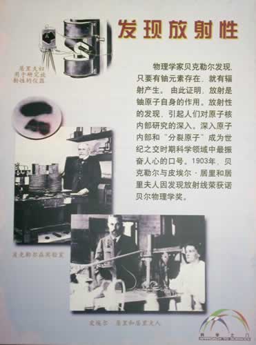 在对X光的研究中,物理学家贝克勒尔发现只要有铀元素存在,就有贯穿辐射产生,由此证明,发射这种射线是铀原子自身的作用。放射性的发现,引起人们对原子核内部的研究的深入。学入原子内部和"分裂原子"从此,成为世纪之交时期科学领域中最振奋人心的口号。1903年,贝克勒尔与皮埃·居里和居里夫人因发现放射线荣获诺贝尔物理学奖。