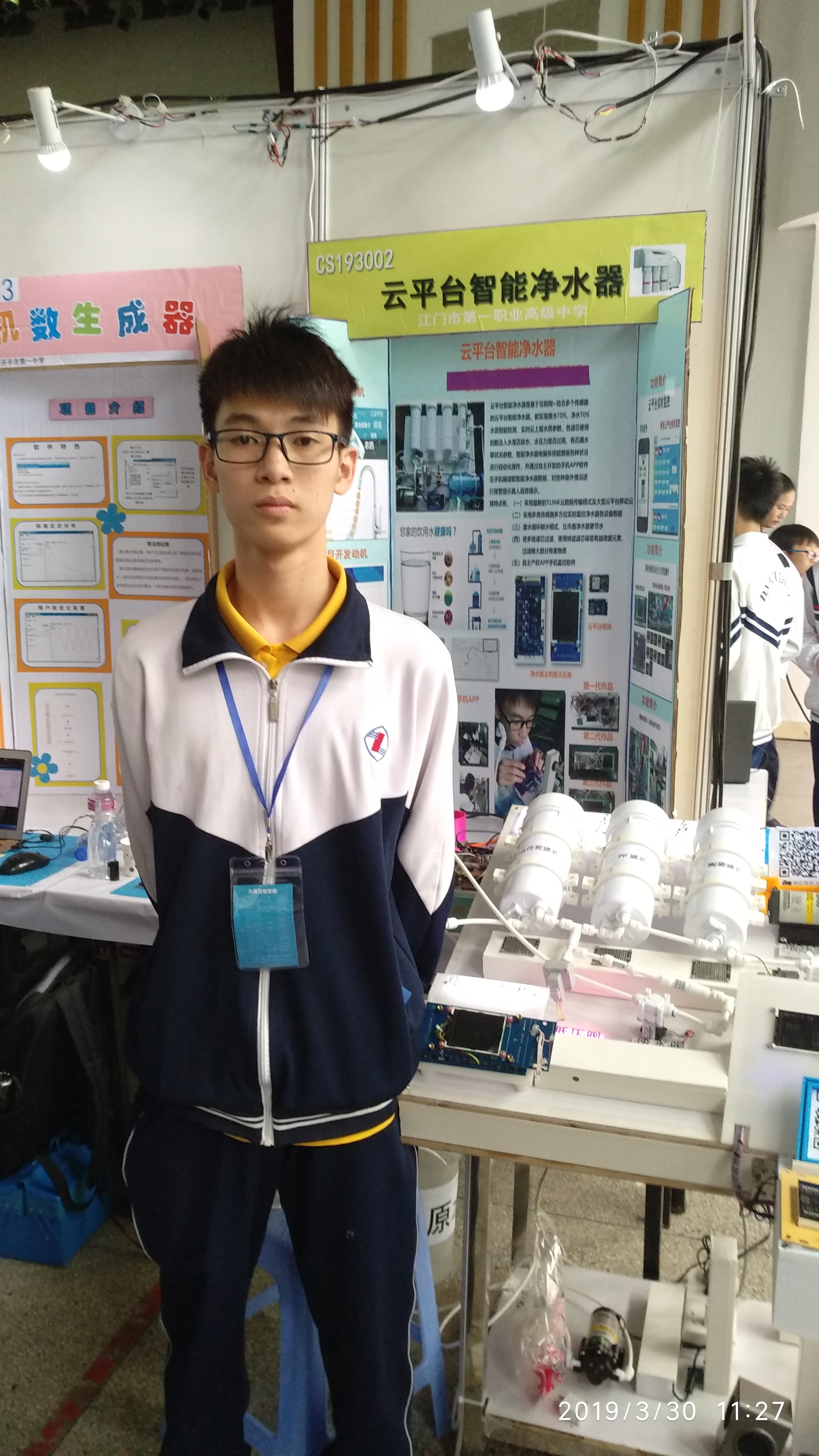 江门市第一职业高级中学的高志峯同学带来他的创意新作“云平台智能净水器”。该新发明不但采取当下流行手机APP物联网模式,集多路传感器智能自动控制,比市面产品更节水节电,目前该发明项目已被一所专注净水器开发的企业看中,并已投入资金开展合作研发,有望不久将来形成产品投入市场。