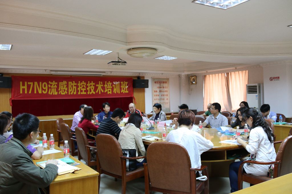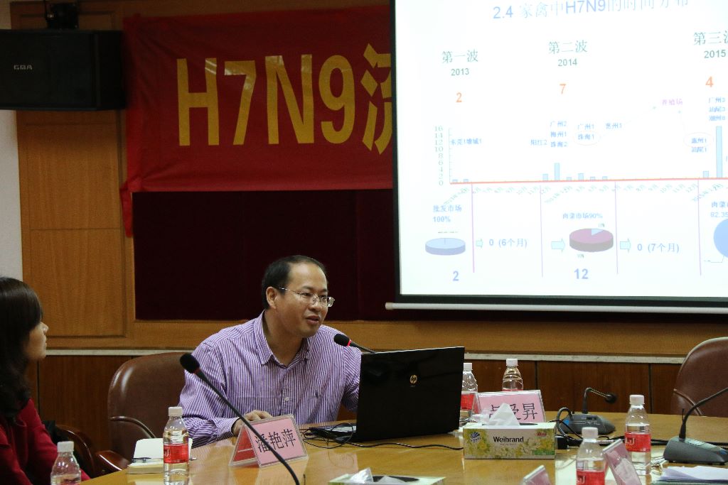卢受昇博士作了精彩的报告,他从H7N9流感的起源、传播途径、流行现状、病毒的研究进展,到农业部的防控政策作了详细的讲解,列举了阳性事件处置案例进行分析,介绍发生阳性事件的处置经验,并对H7N9流感发展趋势进行研判,指出目前防控风险仍主要在活禽批发市场、尤其是农贸市场。随后,市动物疫控中心副主任关建新研究员解读了原种猪场猪伪狂犬等技术指标,强调H7N9流感防控工作是当前动物防疫工作的重点之一,不管是养殖单位还是动物防疫部门,都应该重视起来,为构筑H7N9流感防控长城添砖加瓦。