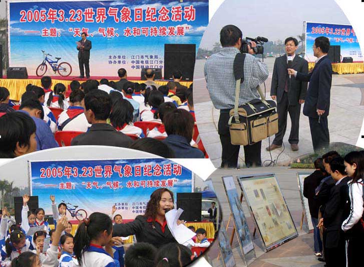 2005年3月20日,广东省江门市气象局、气象学会和中国电信公司江门分公司、移动分公司在江门市东湖广场联合开展了世界气象日纪念活动。针对今年的气象日主题“天气、气候、水和可持续发展”,举办了“气象知识有奖问答”、“天气短信用户现场抽奖”、“现场订制天气短信”、“气象科技服务咨询”“防雷减灾咨询”等丰富多彩的现场活动,同时还适时插播《走近天气预报》、《新中国气象50年》等影片,派发了1万多份气象与防雷科技、科普资料,让气象科普知识走近万千市民。气象局黄江辉局长在开幕式上作了热情洋溢的致辞,气象局副局长、气象学会理事长吴国强同志接受电视台的采访,并对今年汛期天气趋势进行了预测。