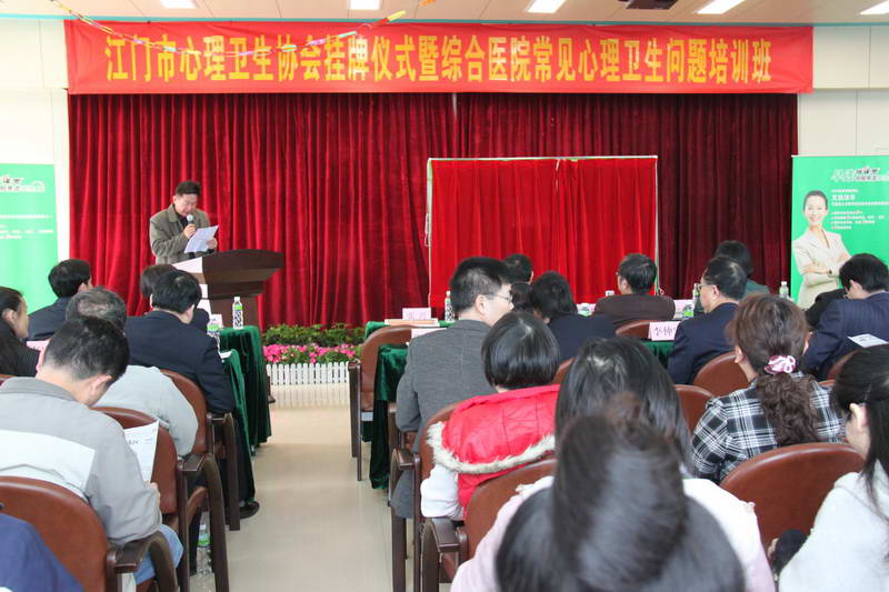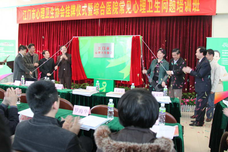 江门市心理卫生协会挂牌仪式暨综合医院常见心理卫生问题学术交流会于3月26日上午在江门市第三人民医院举行。参加有团体会员代表和个人会员代表、来自全市各行业从事心理卫生工作者等150多人。邀请了江门市政协副主席叶一鸣、广东省心理卫生协会会长张晋碚以及市人大、市政协、市卫生局、市科协等领导参加了挂牌仪式。