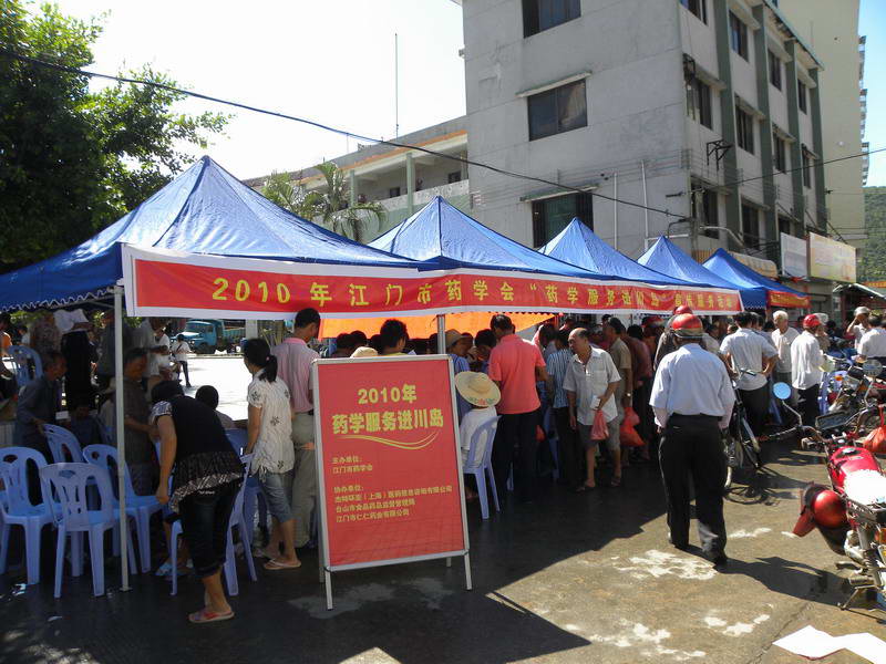 8月14日,江门市药学会组织会员单位和医药单位的代表,配合江门市食品药品监督管理局在台山市下川岛墟承办了“送药下乡暨安全用药”科普宣传活动。来自江门市直各医院和医药单位的专家35名参加了活动,江门市食品药品监督管理局和江门市科学技术协会的领导也出席了活动。