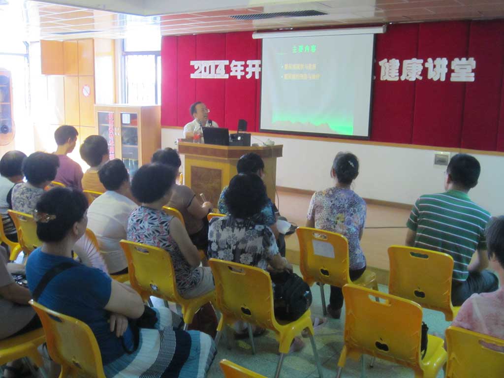 新会区科协为进一步落实江门市2014年“科普进社区—健康讲堂”活动的工作要求,围绕“树立正确健康观念,提升全民健康素养”主题,全面提高社区居民的科学文明卫生意识,倡导健康文化生活方式,于6月19日下午,联合会城街道菱东社区邀请了中华医学会糖尿病学分会微血管并发症学组副组长、江门市医学会糖尿病学分会主任委员、江门市中心医院内分泌科内科主任林健才主任医师到社区为80多名居民群众作《老年人的饮食与健康》专题开讲,受到社区居民群众的欢迎。
