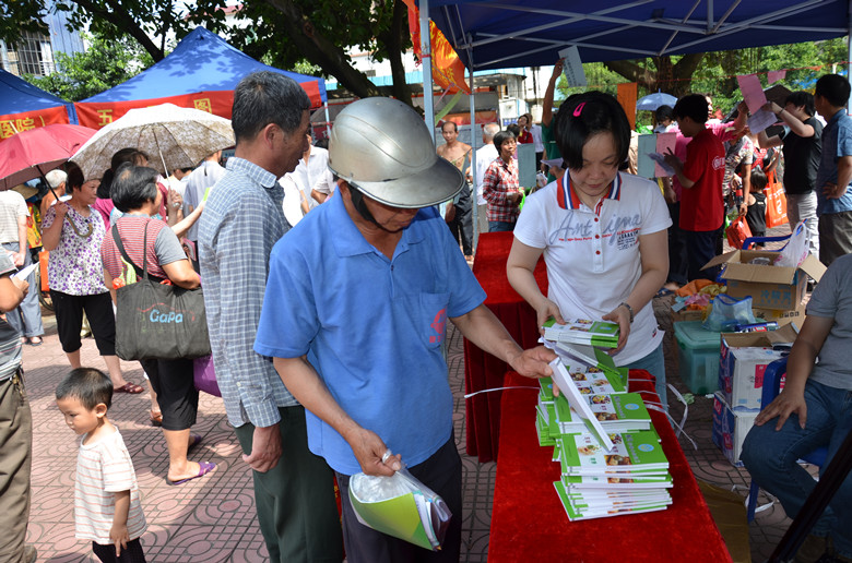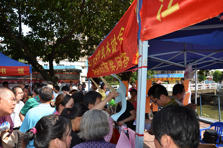 活动广场人头涌涌,热闹非凡,吸引当地群众近3000人参加,群众分别涌向医疗卫生服务、农业推广咨询、科普文化宣传、科技知识有奖问答等20多项服务摊位。市医学会、市中医药学会、市预防医学会、市防痨协会、新会新希望眼科医院现场进行了疾病预防与防治、妇女儿童保健、常见疾病义诊等服务;市药学会现场进行了食品药品真假分辨知识宣传;市农学会、市畜牧畜医学会、市动防所、市农技服务中心、市农检中心、市植保有限公司现场推广农业科技信息、生产技术,展示农业生产的新品种、肥料、农药;市、区科协,科技部门、市气象学会以及市五邑图书馆等单位通过防灾减灾咨询、有奖问答和派发科普书籍等形式进行科普宣传。特别是在市科协摊位进行的科普知识有奖问答,群众争先抢答300多条科普题目。“这是雾霾吗?”,“PM2.5是指大气中直径小于或等于2.5微米的颗粒物,也称为可入肺颗粒物”,科普志愿者与群众现场问答。回答正确的群众领取奖品,眉开眼笑,相互转告,人流一波又一波地川流不息。