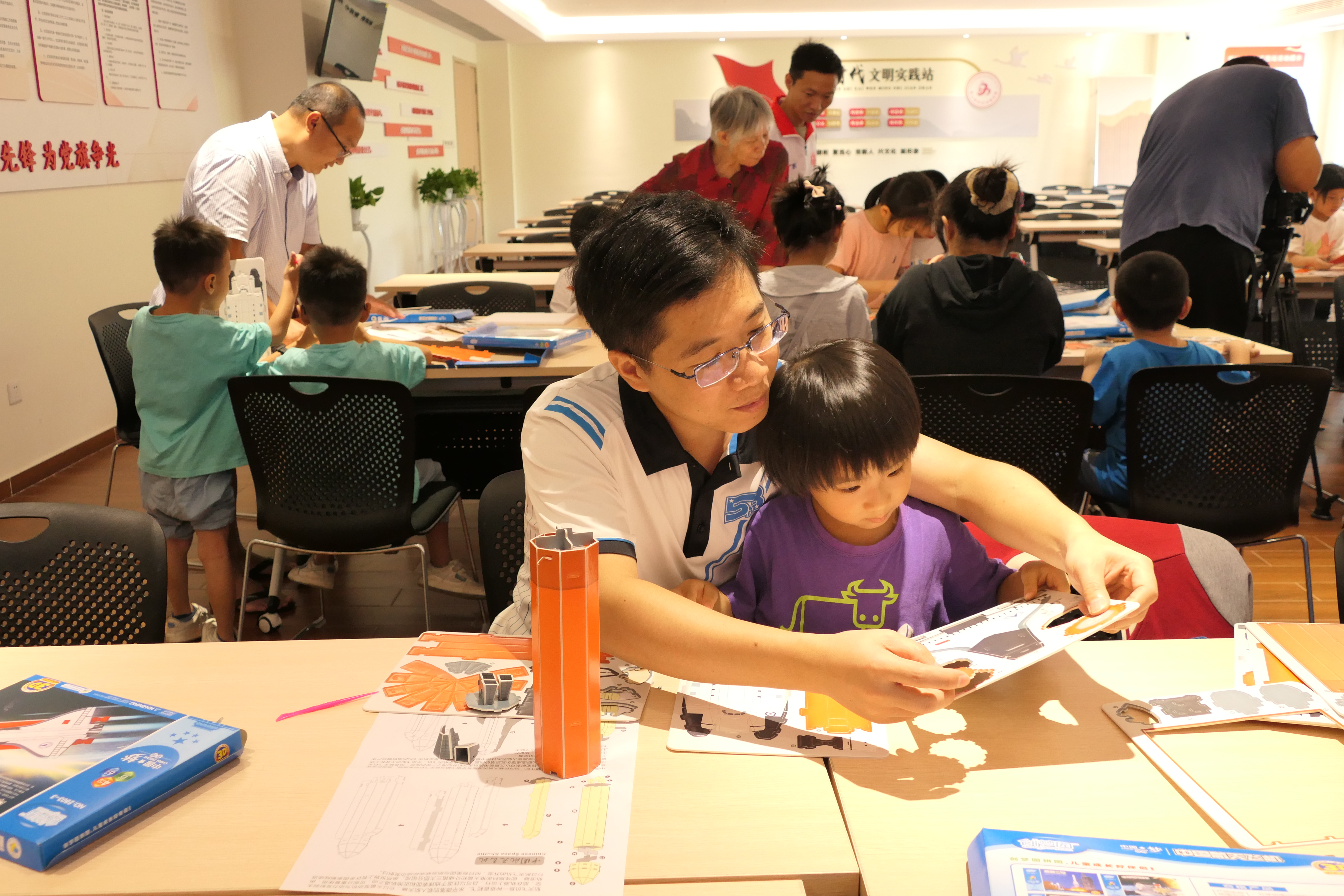 随后的“搭建我的航天飞机”环节,在科技老师的带领下,家长和孩子们开始动手制作航天飞机模型:将纸板上的零件一个个拆下来,按照说明书的相应要求进行拼接、组合,最终制作出属于自己的小小航天飞机。在制作模型的实践操作过程中,既锻炼了家长和孩子们的动手能力和思维能力,培养了亲子之间的感情,同时也加深了对航天飞机构造组成的认识,激发起对先进科技知识的兴趣。