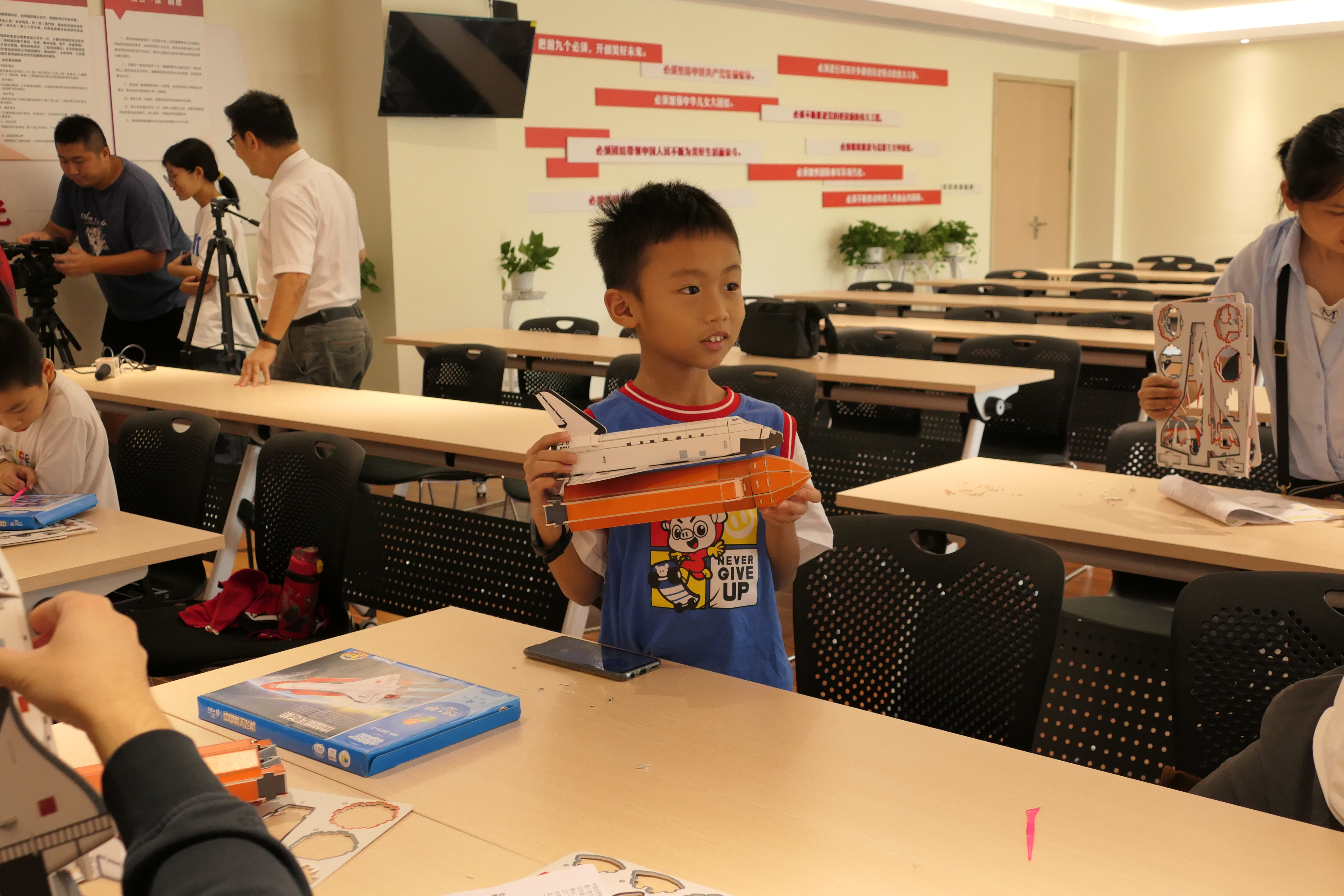 在最后的“我的航空梦”环节中,孩子们轮番上台,畅所欲言。有些孩子分享了自己在搭建模型时的感受体会,有些孩子分享了自己所理解的太空梦、强国梦等等,现场气氛活跃,掌声喝彩不断,大家热情高涨,直至活动结束,家长和孩子们仍意犹未尽。
