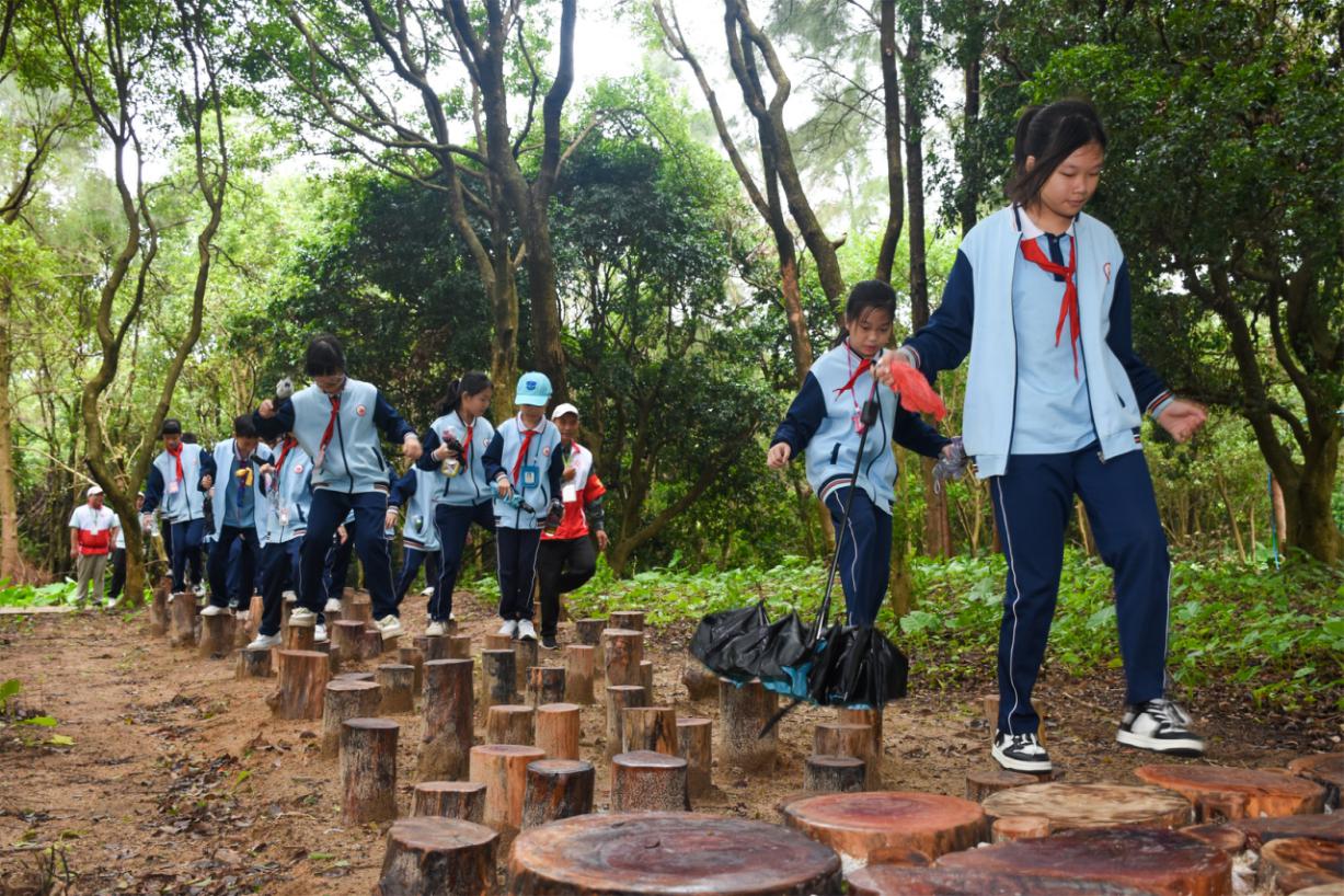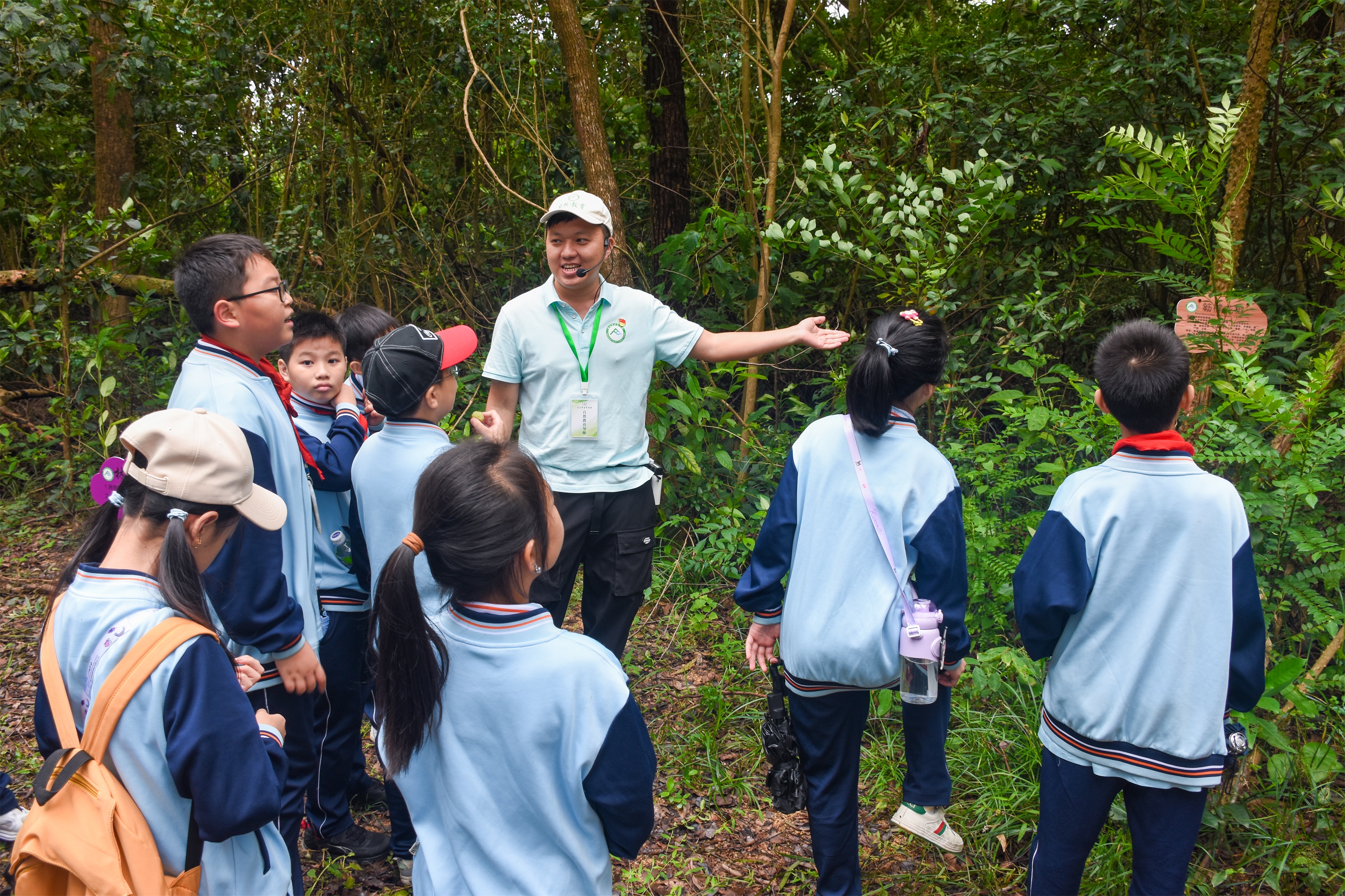 活动当天,在林场自然教育导师的带领下,台城第三小学的学生开启有趣的森林探索活动。在徒步过程中,学生对林场内的森林植物充满好奇,在导师的介绍下,了解了各类植物的生长习性和保护措施,认识到森林结构、林窗、板根的作用。穿过一片茂密的森林后,学生来到余甘子示范林区品尝新鲜的余甘子,了解药食同源以及树立“向森林要食物”的大食物观念。通过森林探索使学生心境平静,在欣赏大自然美好风光的同时激发学生探索自然的兴趣,促进其了解生物多样性,培养学生的观察能力。