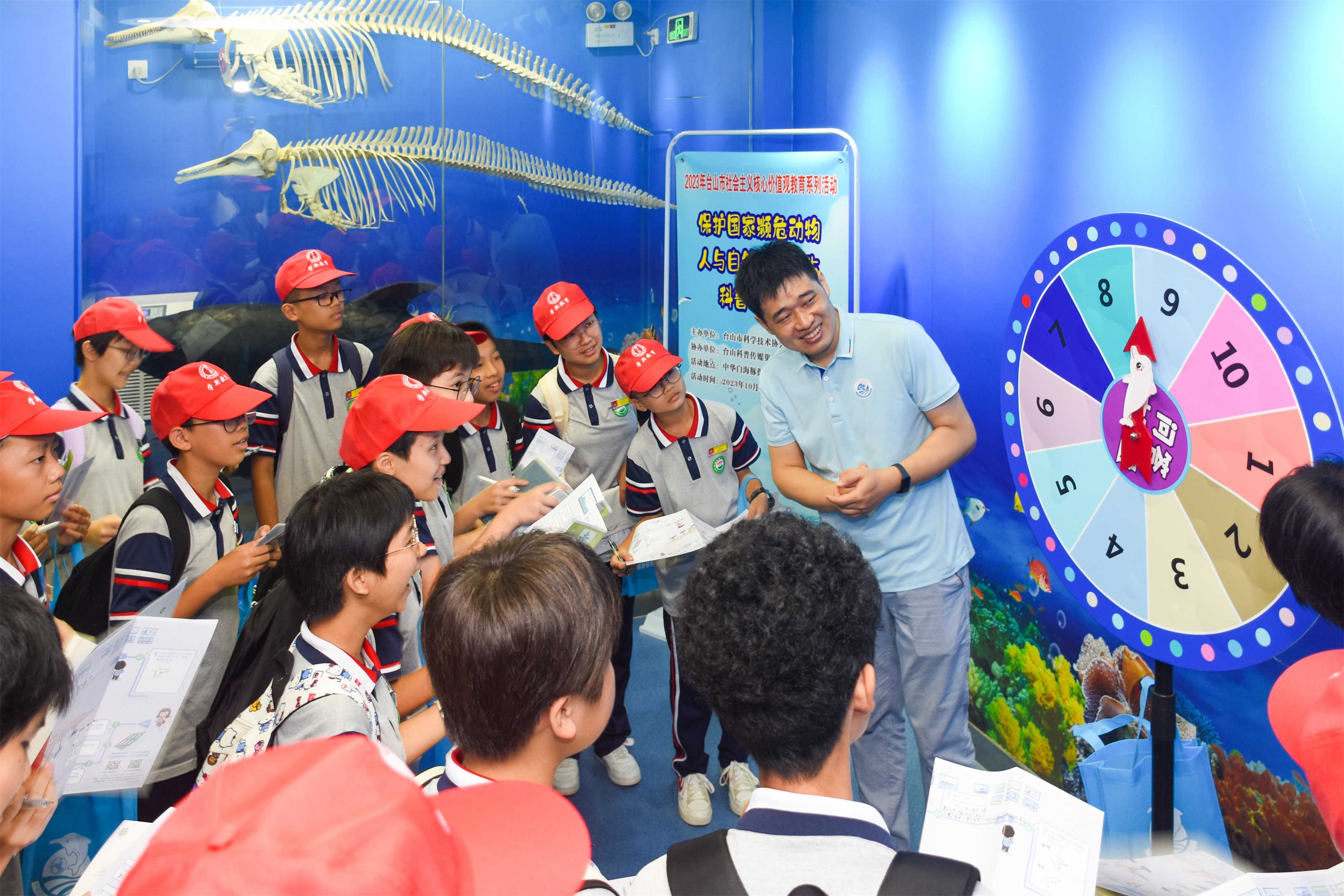 随后,同学们还参观了科普馆,馆内设置有中华白海豚知识、海豚标本展示、海豚照片长廊、保护区日常工作展示及多媒体影音等多个科普板块,通过实地寻找导览地图折页问题答案,大转盘回答问题等互动形式,融科学性、知识性和趣味性于一体,寓教于乐,在游戏中学习知识,加深同学们对中华白海豚及其栖息地的了解,增强了对海洋环境的保护意识。