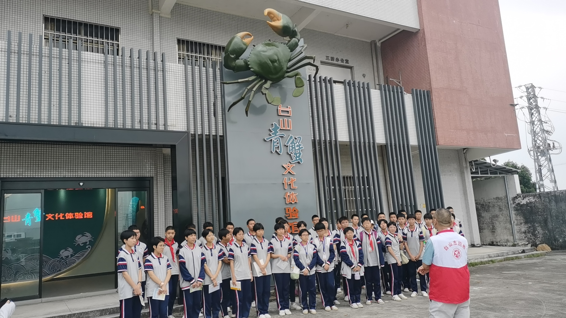 首先走进台山青蟹文化体验馆,映入眼帘的是实时监控青蟹养殖情况的智能设备,学生们对数字化养殖手段感到十分新奇。在听完讲解员对全国农产品地理标志台山青蟹生动细致的讲解后,学生们对台山青蟹的生长环境、养殖历史、食疗价值等有了更深的认识。