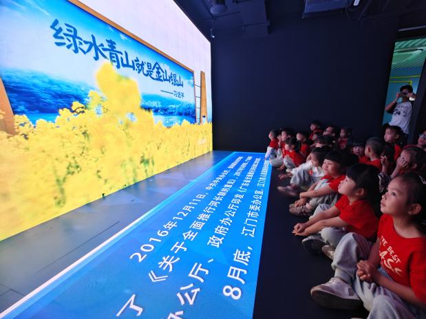 江门、蓬江的水环境特点如何?政府为水环境治理做出了哪些方面的努力?现场通过讲解员介绍、视频影像和治水沙盘等方式,让孩子和家长直观了解江门水系的发展历程以及江门市、蓬江区两级政府在改善水环境方面所做的工作,展示了蓬江区近年来的治水成效,如黑臭水体治理、河湖长制的实施等。