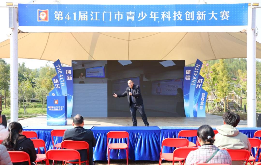 大赛颁奖典礼于当日下午举行,现场气氛热烈。江门市科协主席灵君,江门市委教育工委专职副书记、教育局党组成员、一级调研员谭海鹰,台山市人民政府副市长黄旭晖,江门市市场监管局总工程师刘小如,江门市科技局四级调研员胡兆强,大赛评委会主任、佛山大学教授曾亚光等领导嘉宾莅临现场,与来自全市150多所中小学的师生代表及社会各界人士共同见证了这一科创盛事。黄旭晖在致辞中表达了对各方支持的感谢,并对青少年科技创新人才寄予厚望。评委会主任曾亚光教授分享了评审见解,充分肯定了参赛作品的创新性与实践价值。江门市科协主席灵君在讲话中强调,大赛是激发青少年科学兴趣、培育创新后备人才的重要平台,未来将持续打造以赛促学、以学促研、以研兴业的创新融合发展生态,服务江门教育强市科技强市人才强市建设。